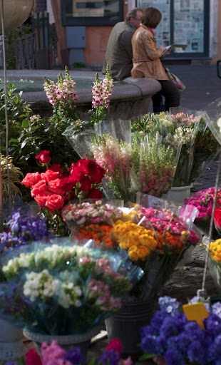 Rómában, a Campo dei Fiorin gyakoroltam ezt a sportot. A tér a középkorban valóban egy virágmezőként volt ismeretes. Mamár csak a piac egyik sarkát bírtokolják a virágárusok, a portéka zömét zöldségek, gyümölcsök, sajtok, tészták, fűszerek teszik ki. Sok túrista zarándolok el erre a piacra (messze nem akkora a tömeg, mint a Trevi kútnál), de ettől függetlenül a minőség egészen ígéretes. Hat évvel ezelőtt innen szereztük az első igazi, zsíros parmezánsajtunkat és idén sem kellett csalódni, volt honnan ellátmányhoz jutni. Ott voltak a lelkes fűszerárusok is, portékájuk mit sem változott az évek alatt. Még mindig lehet náluk vásárolni Pasta alla Puttanesca fűszerkeveréket, amit azóta sem láttam sehol máshol Olaszországban.