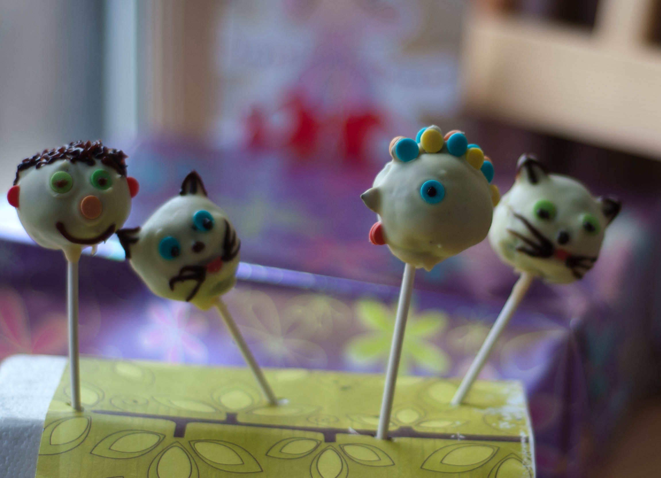 A kész golyókba szúrjunk mandula szeleteket vagy tökmagot a fülük helyére, így mártsuk bele a csokoládéba. A szemeket és a szájat készítsük el cukorkából és hagyjuk megdermedni a figurákat. A bajuszt és az orrot ehető dekor tollal készítsük el.