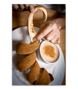 Ezzel az alaphangulattal tértem be a héten a Kürtőskalács Kávézóba. Megkívántam a kürtőskalácsot, legjobb családban is előfordul az ilyesmi. Tehát, valami egészen hasonló, elcsépelt, rövidtávon jól eladható, de alapvetően közhelyekre építő boltra számítottam. Matyó, meg kalocsai; Magyarország térkép, kicsi és nagy; zászló, kevesebb és több sávos. E helyett egy ötletesen egyszerű helyen találtam magam, ahol persze, voltak magyak motívumok, de kellemesek és üdítőek. Azt éreztem, hogy ezen végre valaki gondolkodott, kreativitást vitt bele és ettől sokkal fiatalosabb és megnyerőbb lett a hangulata. Semmi különlegesre nem kell gondolni, okosan formatervezett háromlábú székek, a falon néhány paprika motívum és ennyi.