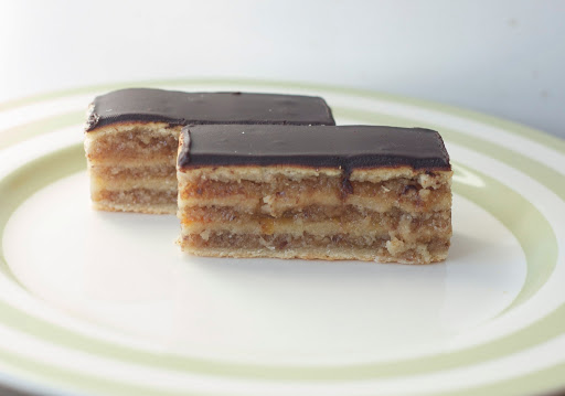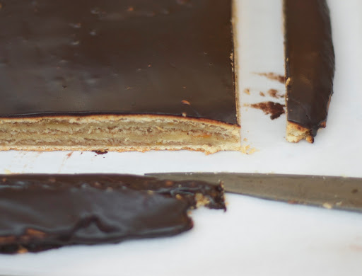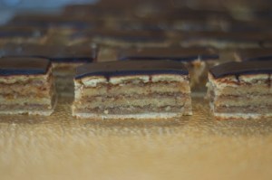 A magazinban szereplő recept hozzávalóinak arányán nem változtattam, azonban a leírást kibővítettem és praktikus észrevételekkel egészítettem ki. Mivel a lírásban két tortának megfelelő mennyiség szerepelt a tésztaféléknél – és ezt nem jelezték sehol, összeállításkor derült ki – így a maradékból készítettem egy második darabot is. Erről készült az alabbi kép. Ebben sokkal kevesebb a krém, mint az első tortában. Sajnos nem tudtam képet készíteni róla, de úgy számuljunk vele, hogy legalább kétszer ennyi krémnek kell lennie a jól sikerült süteményben. A rétegek azonban nagyon jól látszódnak. Piskóta, párizsi krém, marcipán, párizsi krém, dobos lap, kávés krém.