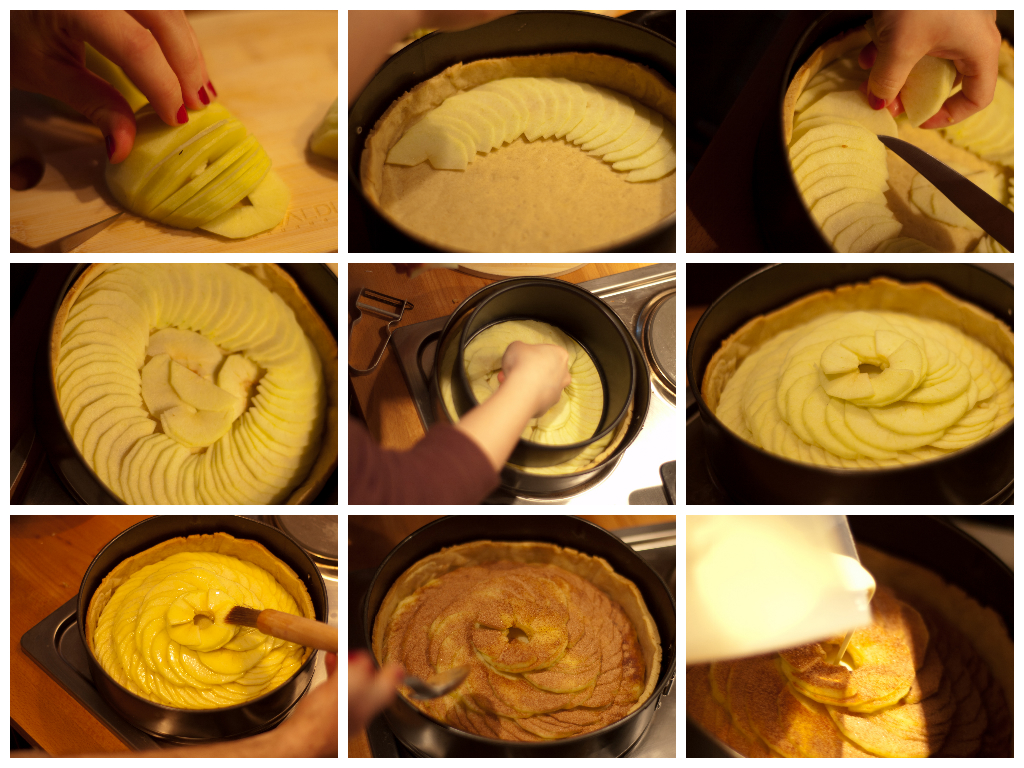 Majd kezdjük el szorosan a tészta széléhez illesztve kirakni a az első kőrt. Ha körbeértünk, az első szeletet emeljük meg egy késsel és csúsztassuk össze az almákat.