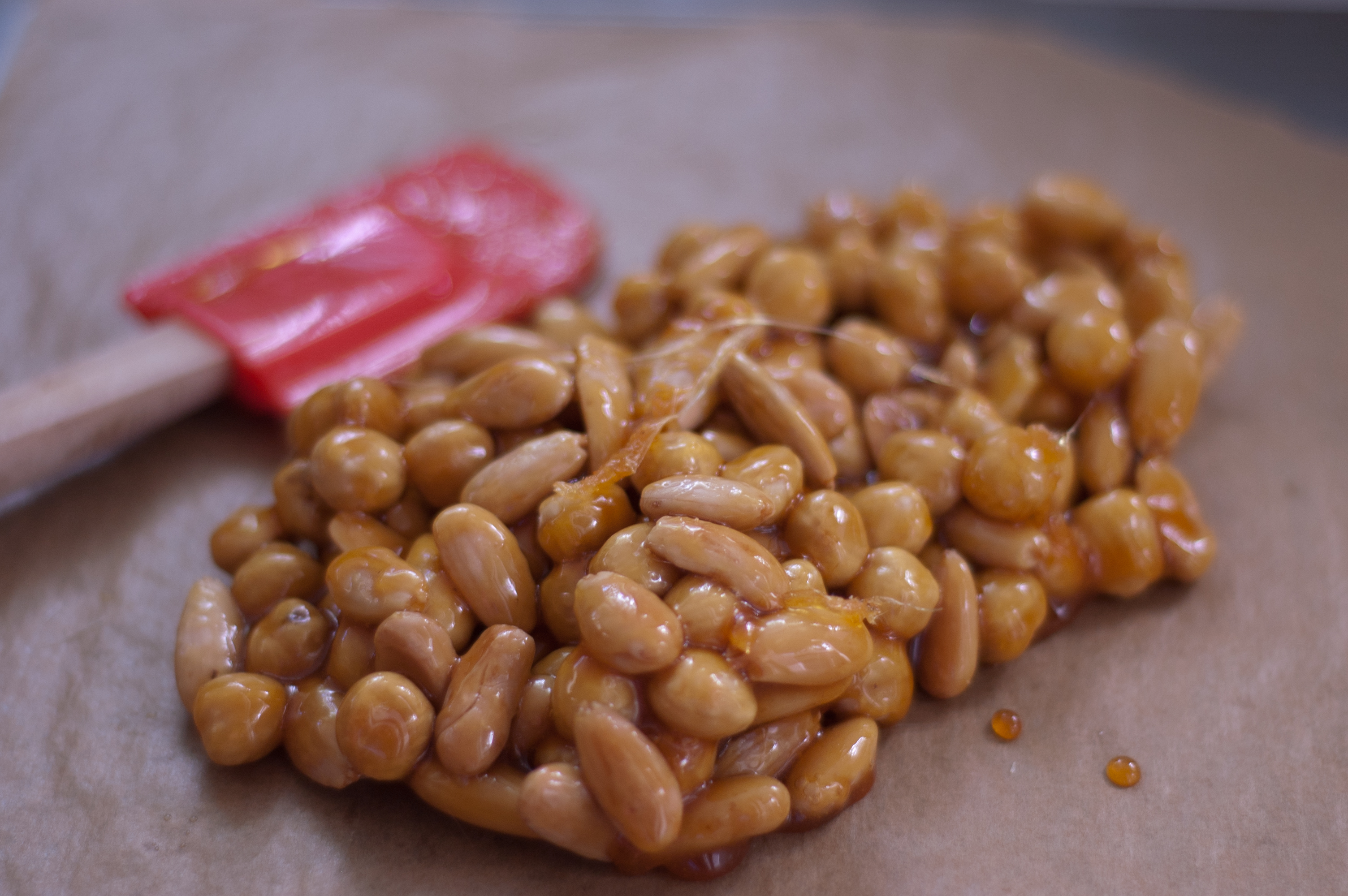 Adjuk a magokat a karamellhez és forgassuk bele egy szilikon spatulával. Utánna öntsük ki egy sütőpapírral bélelt tepsibe és hagyjuk kihűlni.