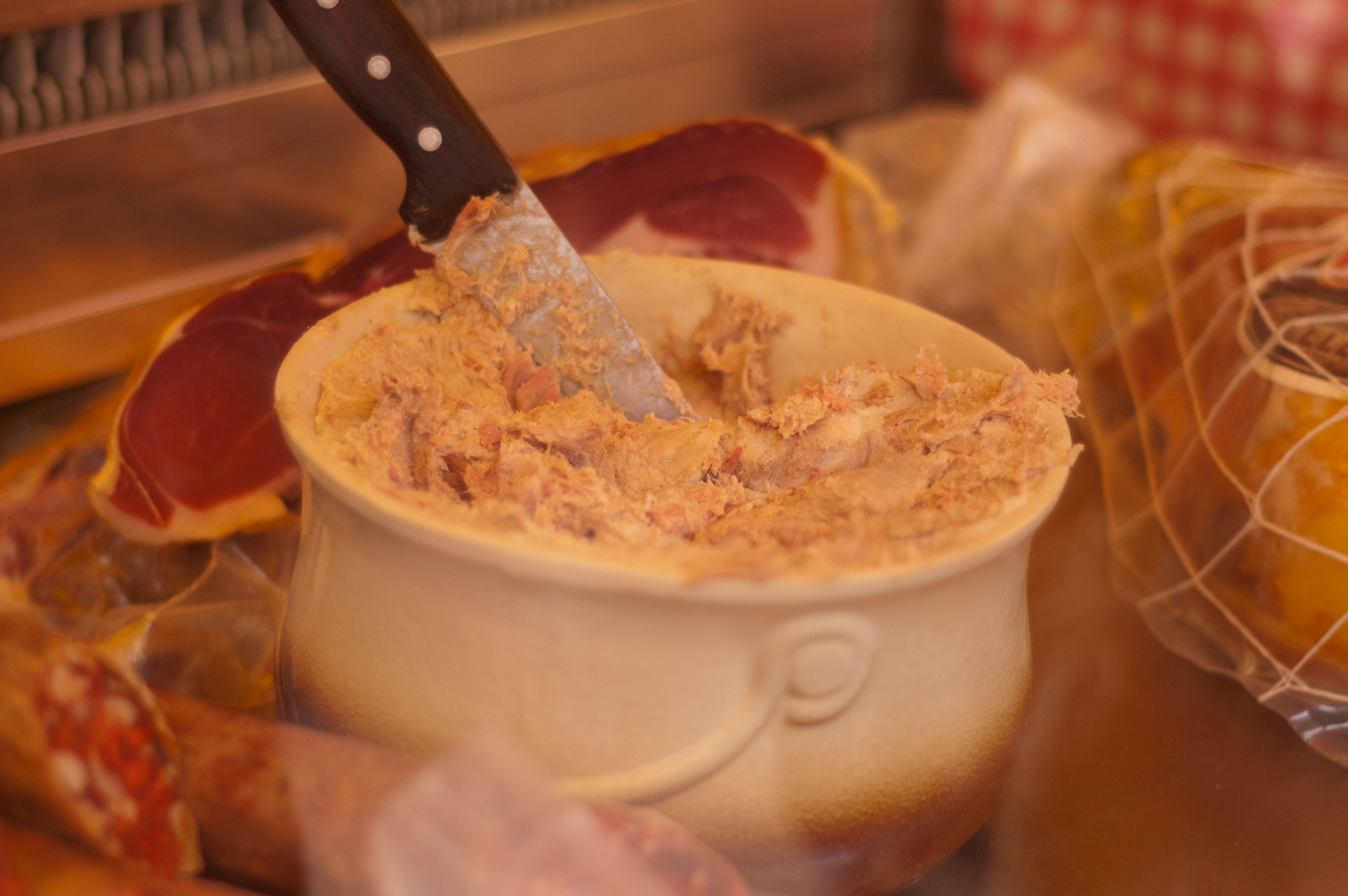 A következő tételt magam sem hiszem, hogy kipróbáltam. A rillettes általában malachúsból készül, amit apró darabokra vágnak és zsírban alacsony hőmérsékleten hosszú időn keresztül főznek. Ebből egy egészen krémes kenhető massza lesz, amit szintén megvásárolhatunk a hentesnél vagy a piacon. Apropó piac, ha tehetjük, mindenképp látogassunk el egyre és ne aggódjunk, ha egy mukkot sem tudunk franciául, ha üzletről van szó nem zavartatják magukat. Tökéletes piknik hozzávalókhoz lehet hozzájutni. A családi válalkozásokat könnyű felismerni, egymás melleti asztalon árulja férj a kolbászokat, feleség a sajtokat.